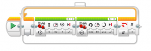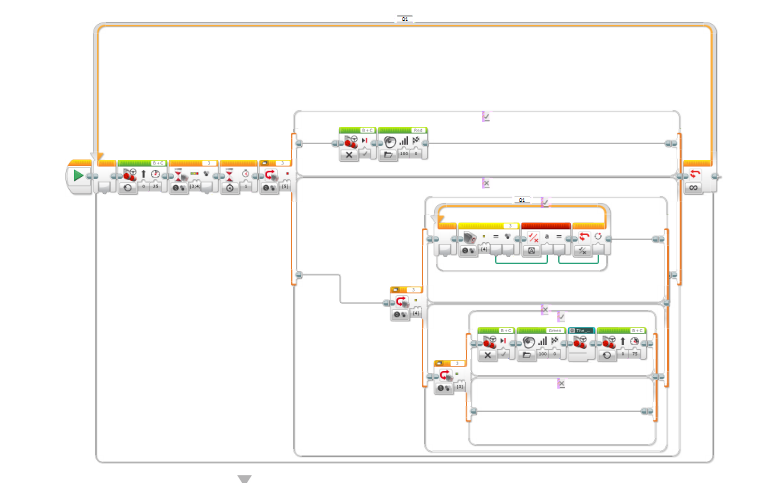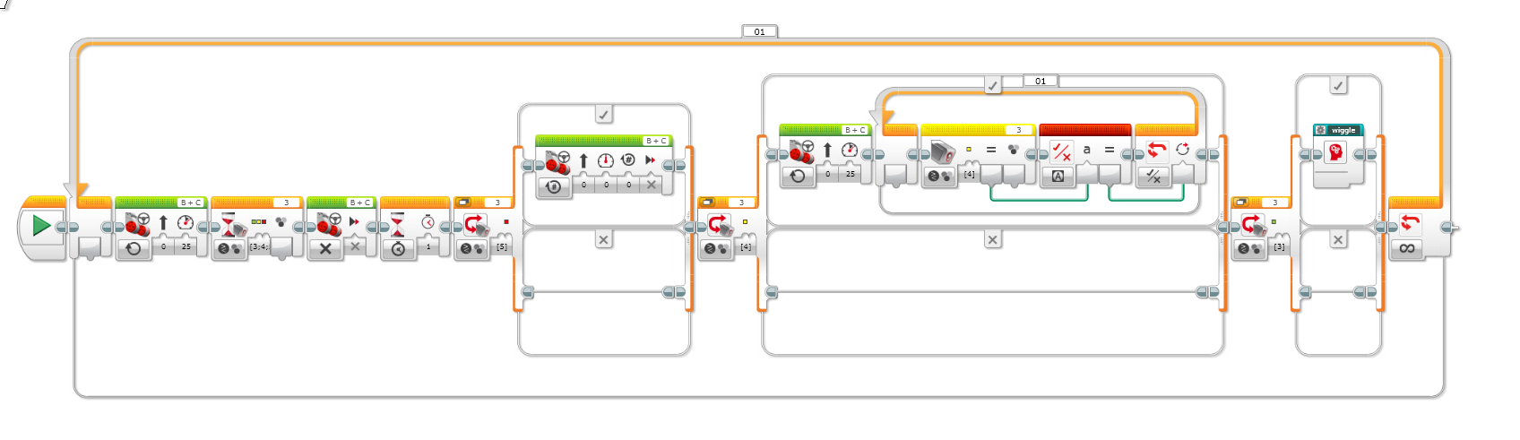 - If the colour is not red nor yellow and it is green then stop motors, run the My Block called “The_Wiggles” and then go back to 1.