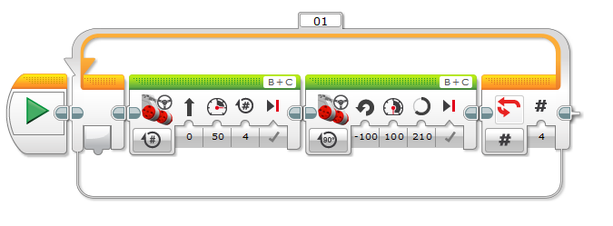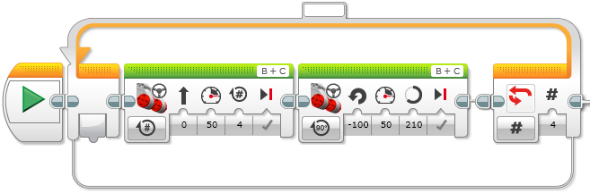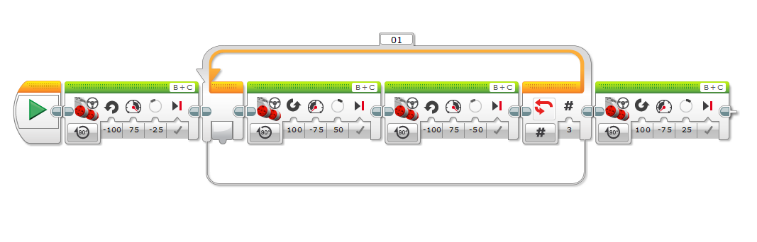 This My Block starts by turning the robot 25 wheel degrees left by moving the wheels. It then repeats turning 50 wheel degrees left and right 3 more times. Then it finally finished by turning 25 wheel degrees right.