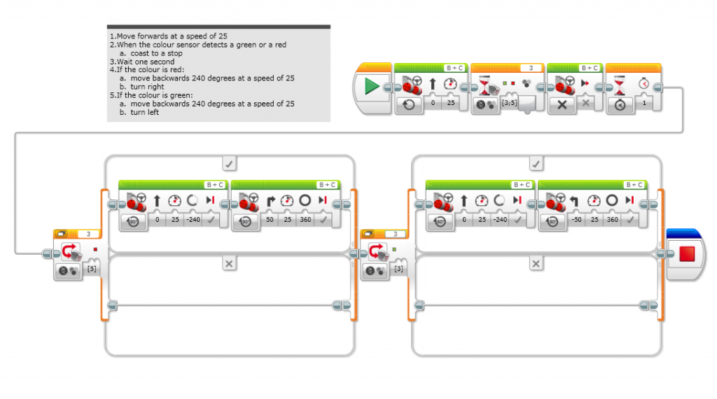 - If the colour is red then stop motors, say “RED” and then go back to the beginning.