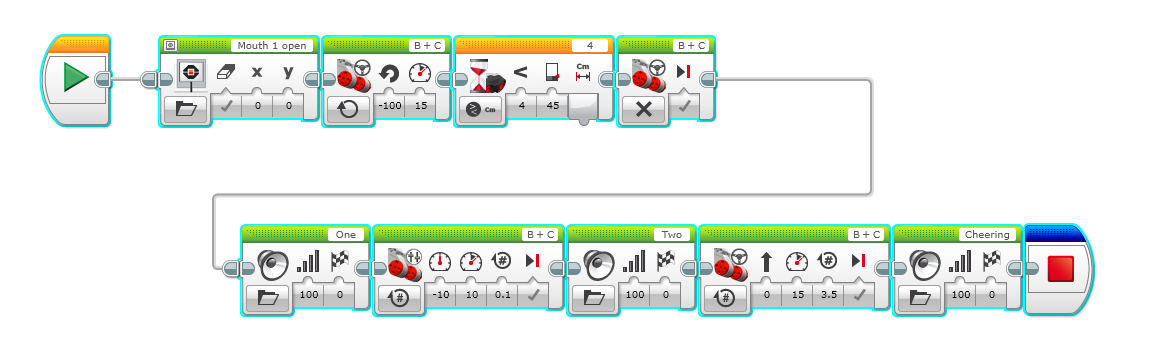 After: I made the robot start at a speed of 30 but adds 0.01 to the speed and doing that for 1500 times and making the final speed 45. At the end I put a sound block that made a crowd cheer.