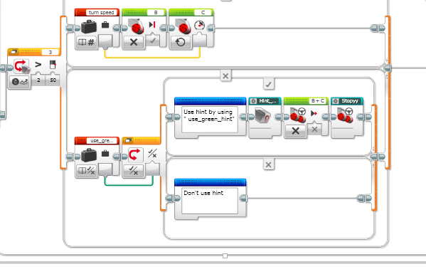 Firstly, in the senior competition there are those green hints. I added a variable called “use_green_hints”. I used that to look for the hints if I turned the variable setting to true. If I put it to false, the robot would not be looking for hints. This would be useful because in the junior competition, there are no hints. But if you compare that to the senior competition, there are hints.