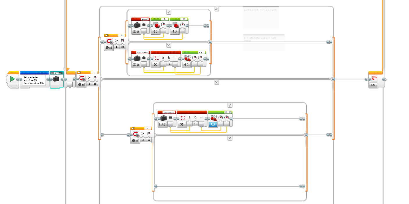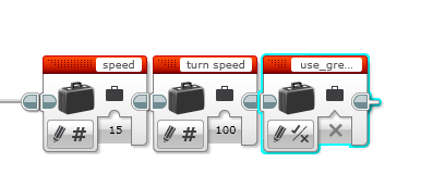 With that true or false variable, I put it in to my ‘Declare Variables’ ‘My Block’ along with the speed and turn speed variables, as you can see below on the far right.
