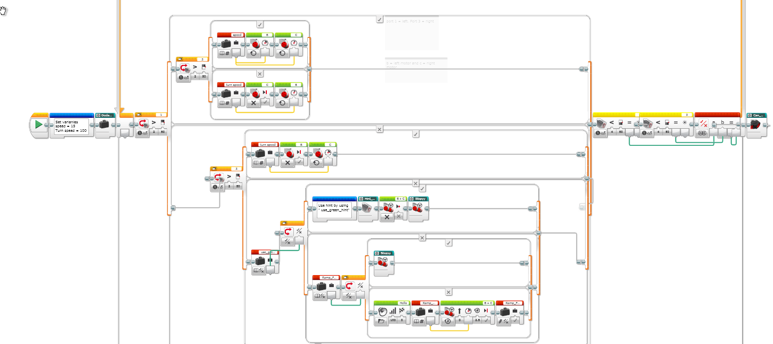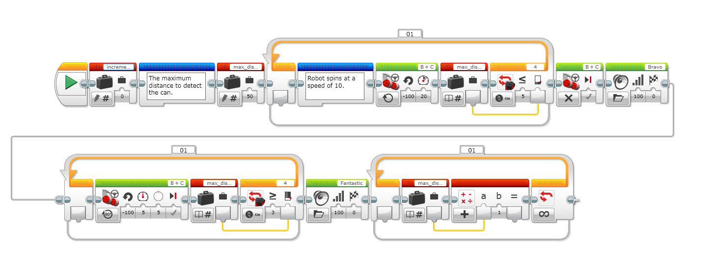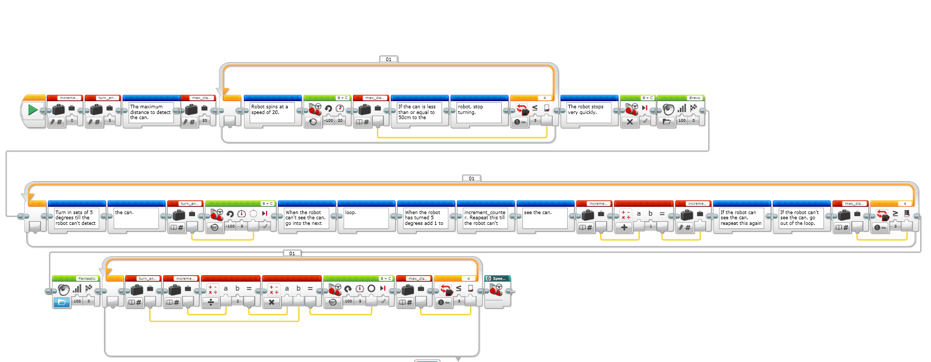To start things off, I looked at some examples from last year. I made 2 new variables called ‘increment_counter’ to know how many degrees the robot has turned and ‘max_distance_to_can’ to locate the can within the variables value. (Note: ‘max_distance_to_can’ may be changed. I’ve set it to 50 at the moment). When the can is located, the robot will stop and then turn 5 degrees till the robot cannot see the can. When it can’t see the can it will count how many 5 degree turns it has done and divide that number by two. When you get the answer the robot will turn that amount of degrees in the reverse direction and stop. At this point, the robot should be pointing at the can. Last, and finally, the robot will move forwards and push the can out of the green chemical spill.