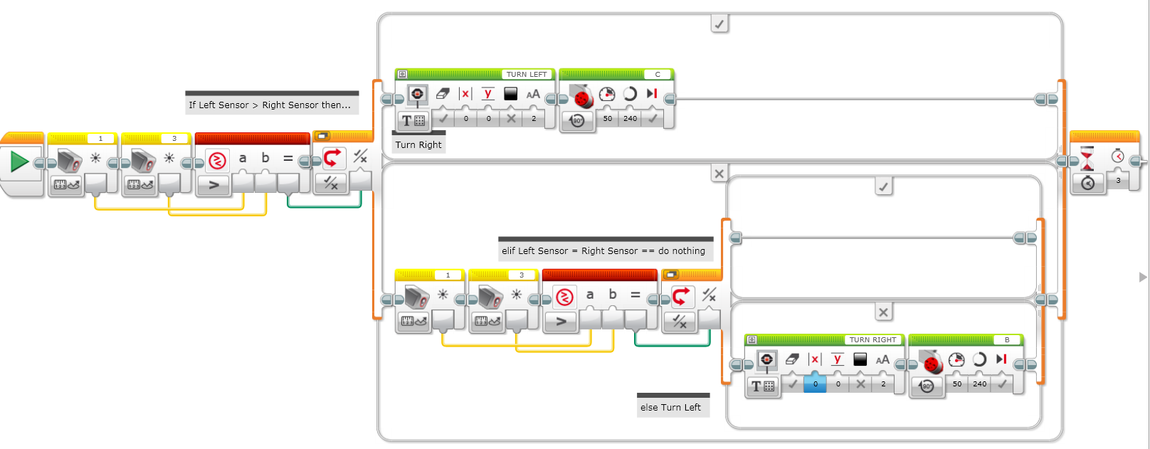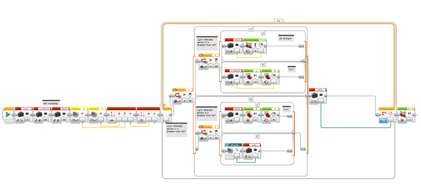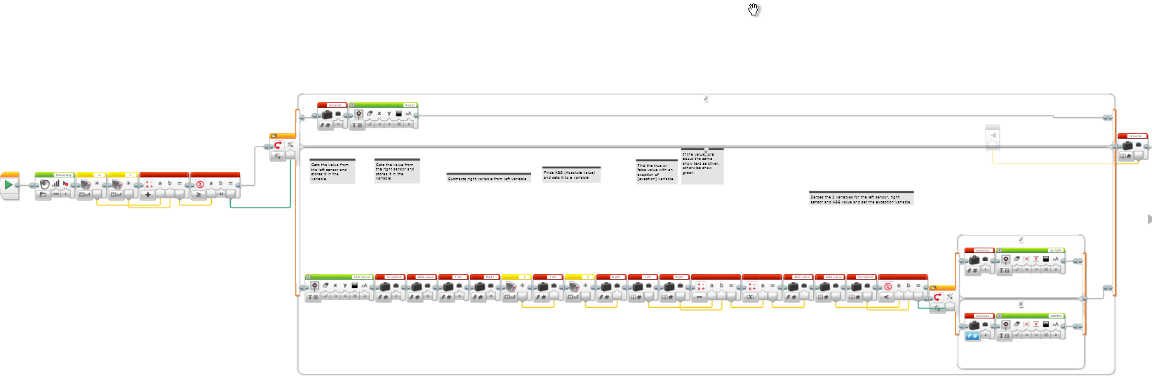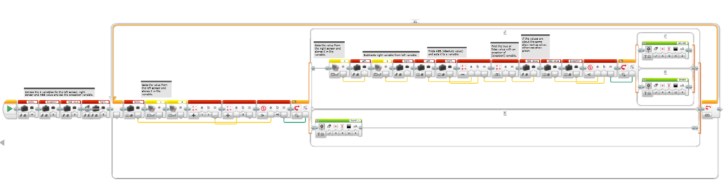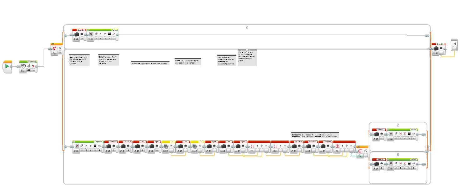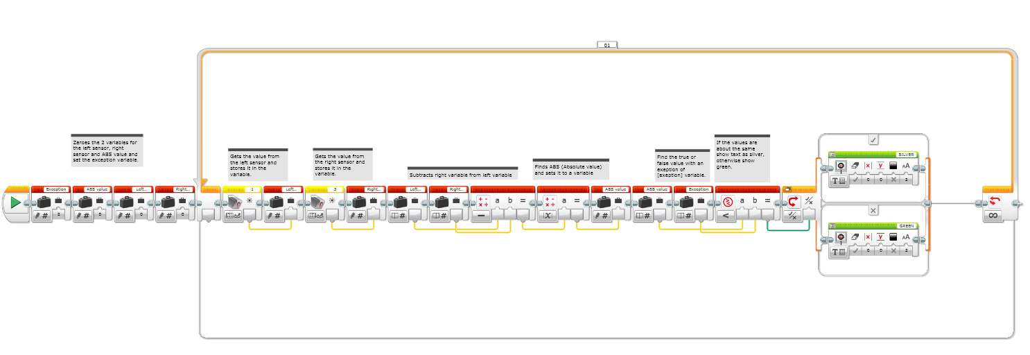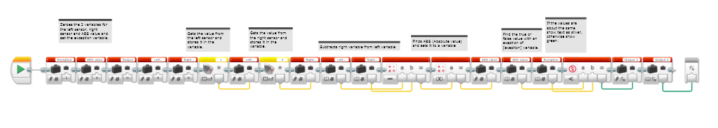Imagine the left sensor has a reflected light value of 56 and the right sensor’s value is 70. The program would find the answer by finding the reflected light from the sensors, in our case 56 and 70, and puts their results into the red block (a math block). The math block then subtracts the first sensor from the second (56-70) and finds the answer (-14). That answer is then put into the next red block, which finds the absolute value. (absolute value ignores the – sign. So negative numbers become positive numbers and positive numbers stay positive numbers.) In our case the absolute value would be 14. The next math block checks whether the absolute value is less than or equal to 2. Then, the yellow blocks check whether the sensors values are less than 20.
