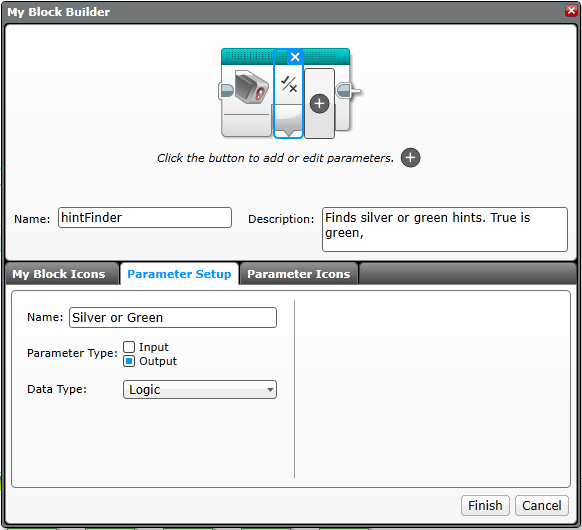 This week I updated my line-following code to include the hint-finding MyBlock. I had to connect the logic output to a logic variable, which cut the program out of the infinite loop.