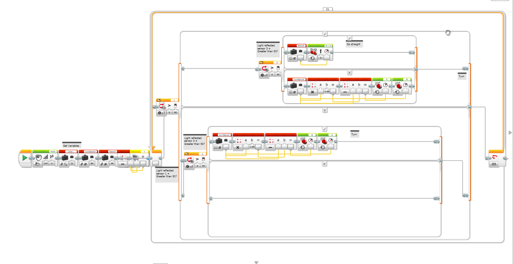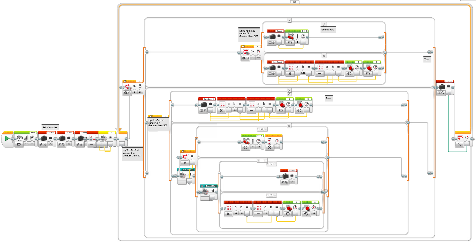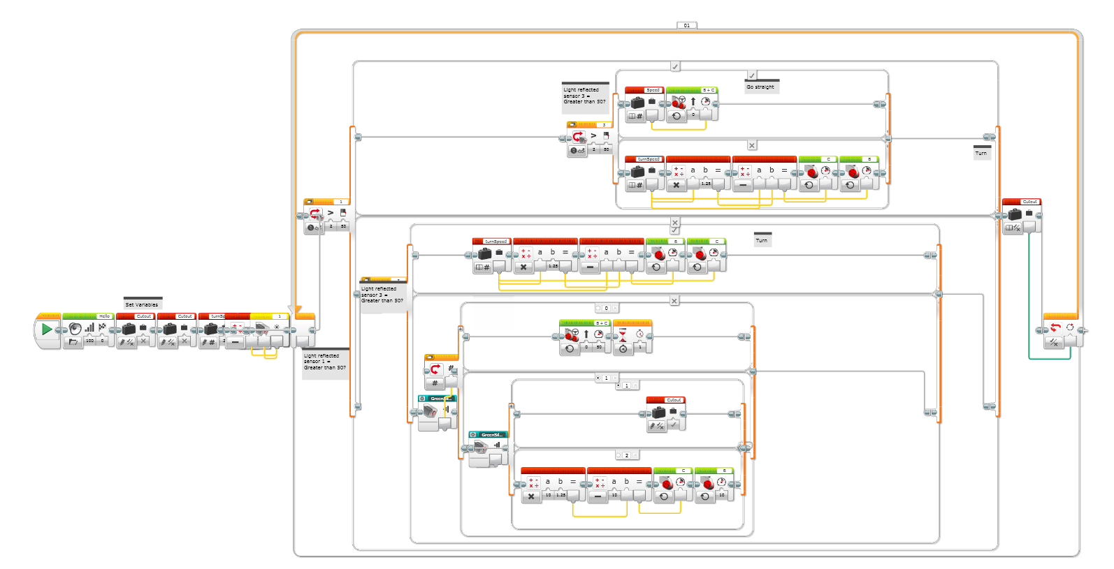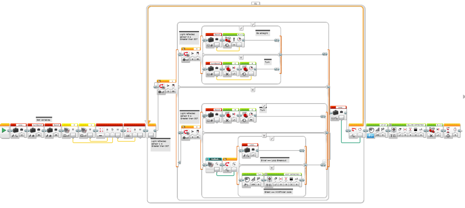 As in the watertower code, I am setting the vairables at the start. One of the variables, watertower found, is set to true. I will explain this later. The code then enters an infinite loop, than checks through the watertower code. If no watertower is detected, then the robot checks the reflected light intensity of sensor 3 (the right sensor), if it is higher than 40, the robot assumes that sensor is on white and takes the top path, otherwise it takes the bottom.