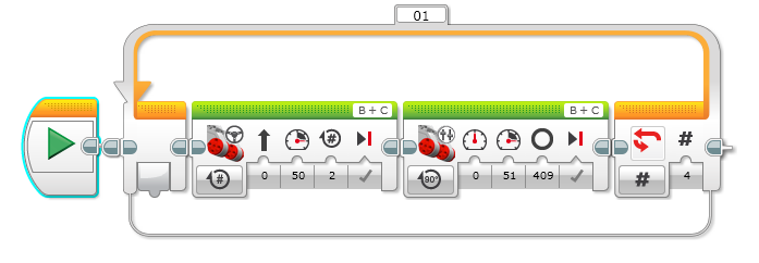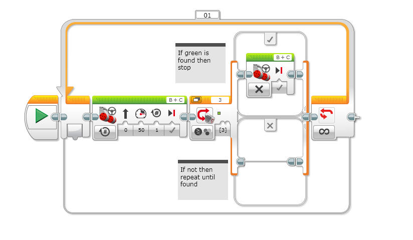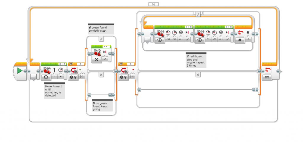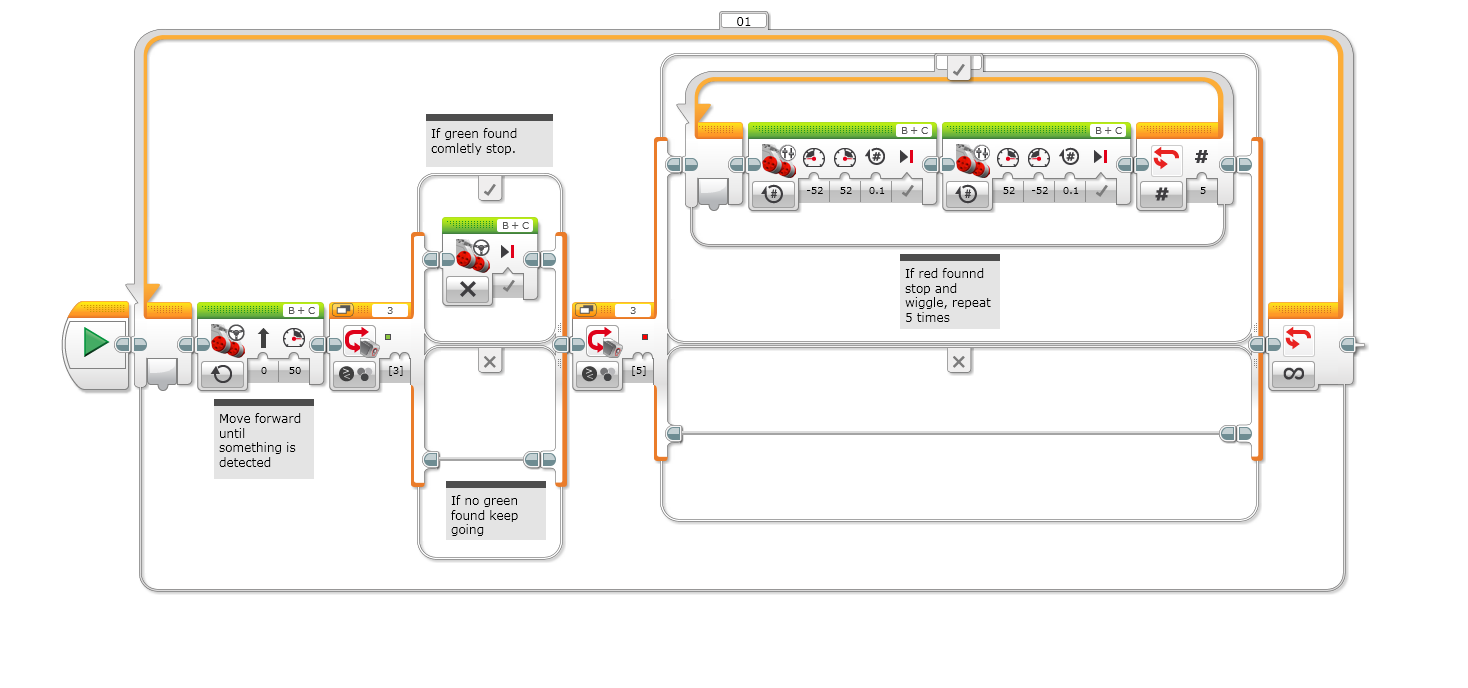 This is where it gets complicated to explain. The first 2 yellow blocks are detecting the reflected light, then that result gets put into the red block that takes those two answers and subtracts them. The answer to that gets put into the next red block which finds the absolute value of the number. That answer gets put into the next block and it asks if that number is less than 2. Then the yellow block checks if the right sensor is less than 20, if it is and if the absolute value of the other equation is less than 2 it should take the top path because it has found silver.