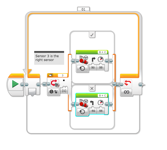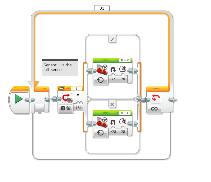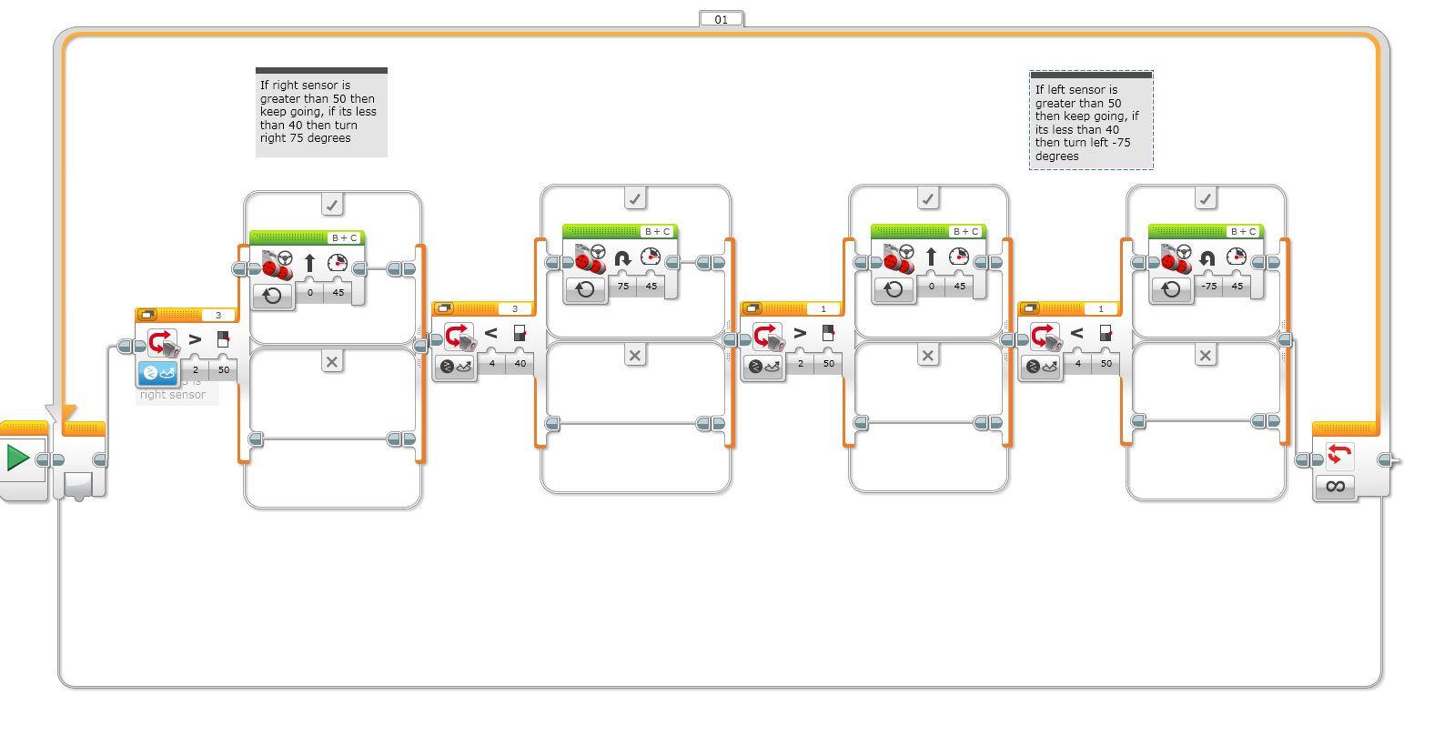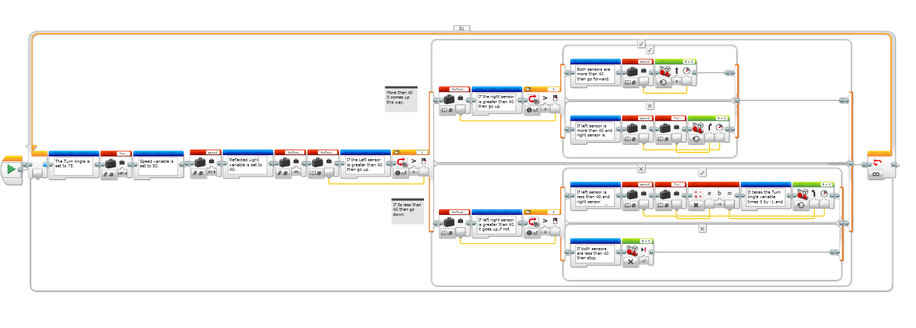 That first orange block on the left side is detecting if the right sensor is greater than 40 then it should take the top path but if it isn’t then it should go down. If it goes up it gets asked another question, is the left sensor greater than 40? If yes then take the top path if no then go down. If for both those questions its a yes then it means the robots on white so it should go forward.