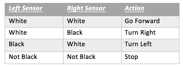 Now back to that first question… if the answer was no then it would go down, meaning the right sensor is black. Once again it gets asked a second question, is the left sensor greater than 40? If yes take the top path if no then go down. By taking that top path it means it needs to turn right to get back on track.